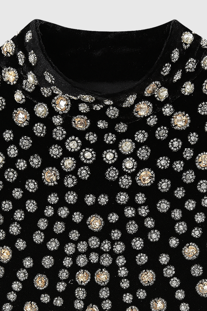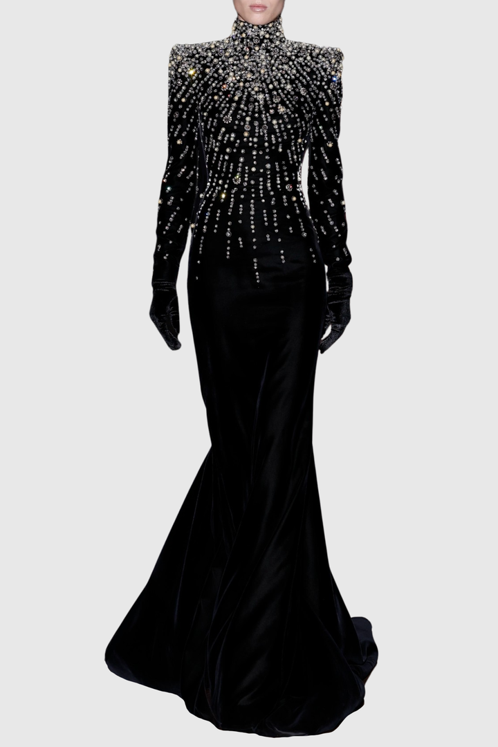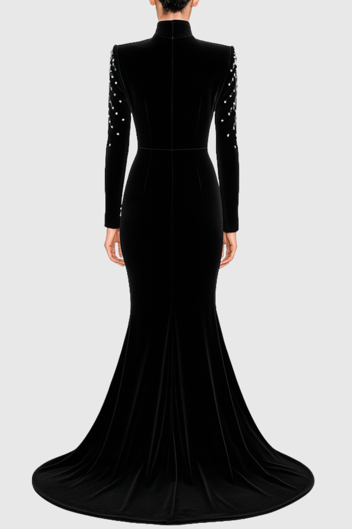 Elevate your evening wardrobe with this stunning velvet maxi dress, adorned with intricate diamante embellishments that catch the light with every movement. The luxurious velvet fabric drapes beautifully, creating an elegant silhouette perfect for formal occasions, galas, or upscale celebrations. The shimmering diamante detailing adds a touch of glamour and refinement, making this piece a show-stopping choice for those who appreciate timeless sophistication. Designed for the discerning woman who values quality and distinctive style.